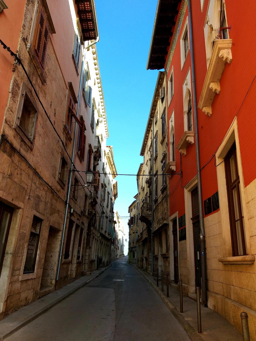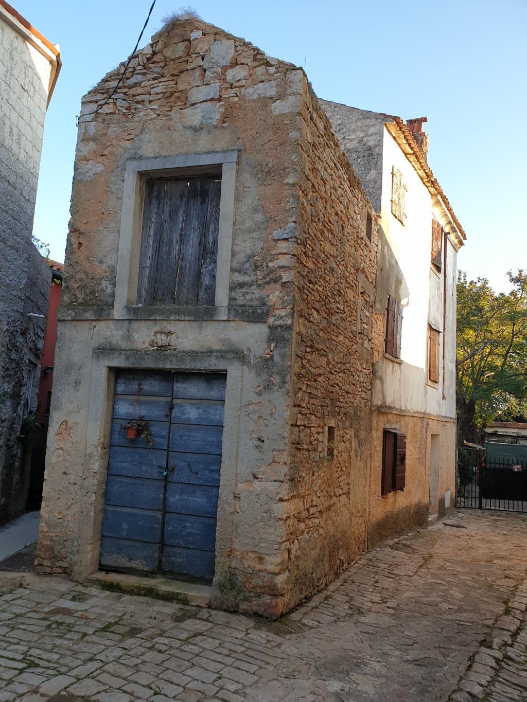 Tako ali drugače – Vodnjan je rojen iz kamna in tak je še danes. Preprost gradbeni material, obstojen in hkrati okras – zlasti plemiških in bogatih meščanskih hiš. Gospa Morena je vsako toliko zaustavila korak in nam usmerjala pozornost na kamnite stile (gotsko – beneški, baročni, renesančni) in detajle. Skoraj vsako hišo, zlasti vzdolž najdaljše ulice (približno 2 km) v Istri, v kateri so drug zraven drugega živeli obrtniki in trgovci, so hiše krasili unikatni grbi, kamnite glave, stebri, balkoni, okna in portali. Balkone so vodnjanski kamnoseki krasili z rastlinskimi motivi. Stebri so imeli uporabno in estetsko funkcijo. Krasili so jih v korintskem stilu. V zgornjih nadstropjih smo opazili tudi nekakšne kamnite nosilce z luknjo, v katere so vstavljali lesene palice, ki so jih uporabljali za obešanje in vlečenje ročno tkanih tkanin. Nekatere hiše imajo še kamnite stopnice – baladurje. Kamnite glave resnega videza nad okni ali vrati, kot da nas opazujejo in kontrolirajo življenje na ulici. Okrašena, večslojna okna (bifore, trifore) dajejo pročeljem razgiban, a skladen videz. Staro mesto pa ima še eno zanimivost najkrajšo in najožjo uličico (50 cm). Sreča, da smo vsi »elegantni« in smo se brez težav sprehodili skoznjo. Posebni so tudi obokani podhodi, ki so skrajšali pot z ene strani najdaljše ulice na drugo stran. V podhodu so zazidani tudi vsi vogali, da se tatiči in nepridipravi niso mogli skriti. Posebnost mesta so tudi notranja dvorišča, ki jih ogreva sonce (izredna zamisel) in dimniki – čisto vsak drugačne oblike.