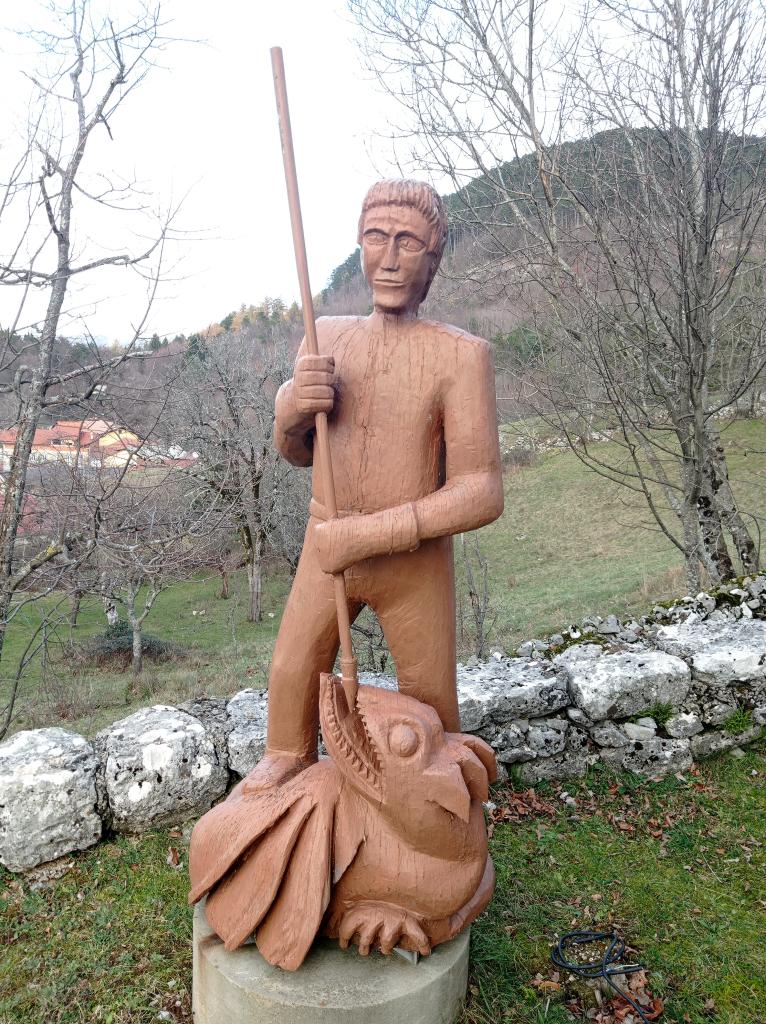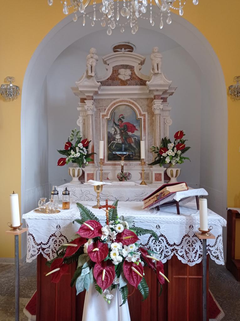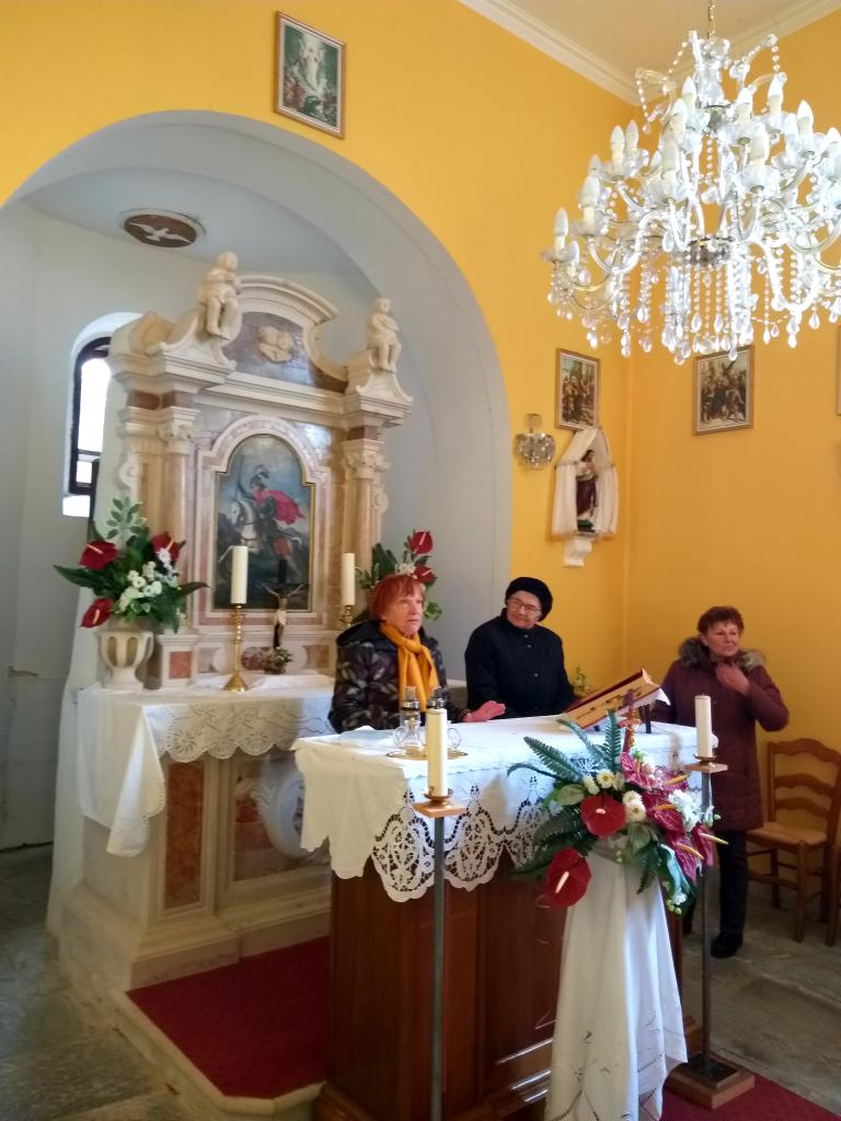 V cerkvici nad vasjo nas je pričakala ga. Bruna Poklar, ki je tudi njena skrbnica. Najprej nam je povedala legendo o sv. Juriju, ki je pokončal lisaškega zmaja. To se je zgodilo nekega davnega, davnega 24. aprila, ki je še danes največji vaški praznik v zahvalo zavetniku. Cerkvico so sezidali in opremili ter večkrat obnovili složni vaščani sami, kot pravi zadnji verz ge. Sonje v pesmi Liščani i Liš´šćice: Si za oniga od´n za se!