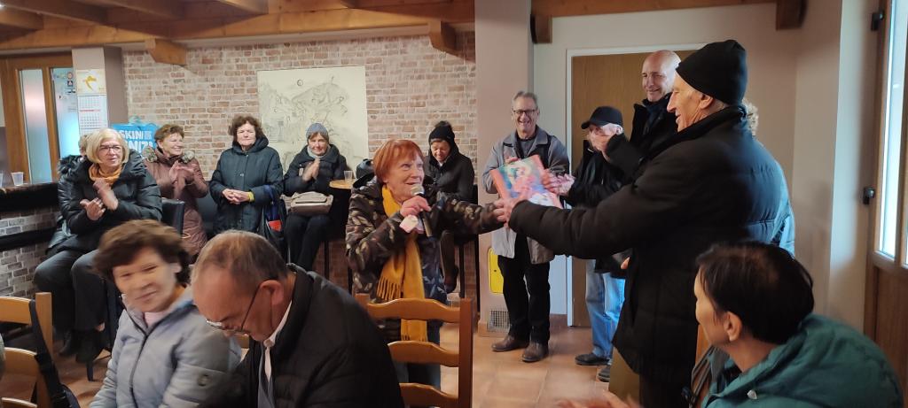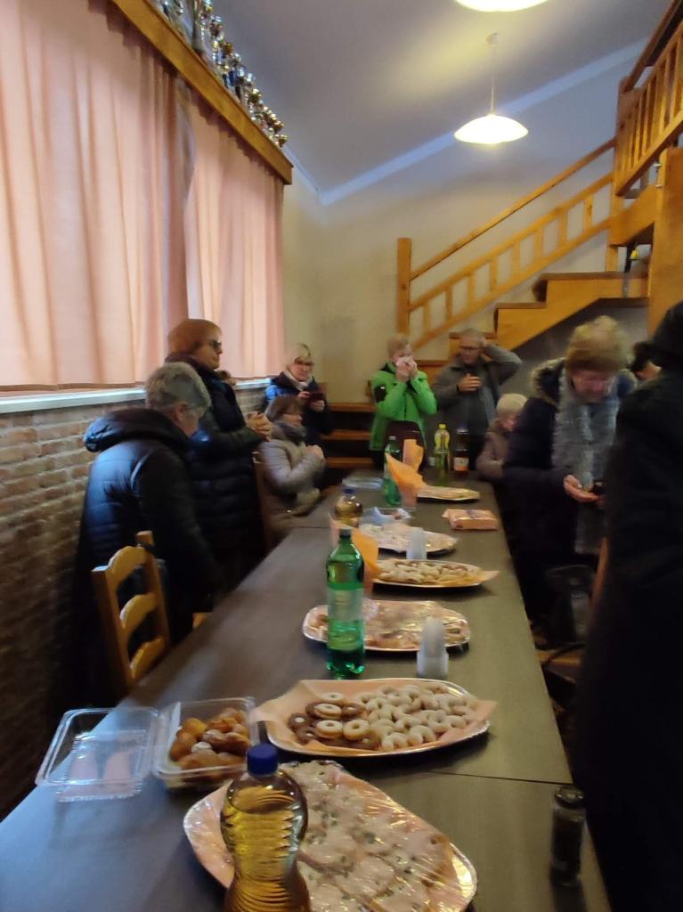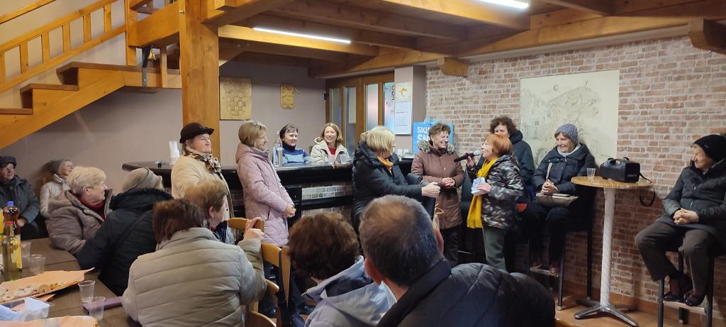 Po ogledu vasi smo prišli do vaškega doma, kjer so nas gostiteljice bogato postregle. Gospa Sonja pa nam je prebrala še nekaj svojih pesmi v klenem narečju. Izkoristili smo dogodek in pred koncem zaželeli z besedo in s pesmijo vse najboljše našemu Stanku Novaku, ki je pred kratkim praznoval vstop med »dolgožive« – 90. rojstni dan.