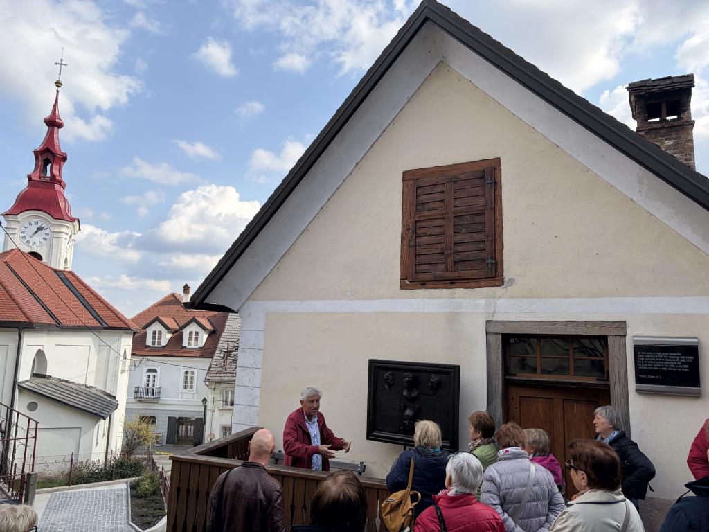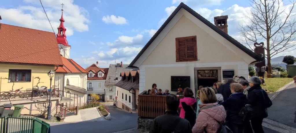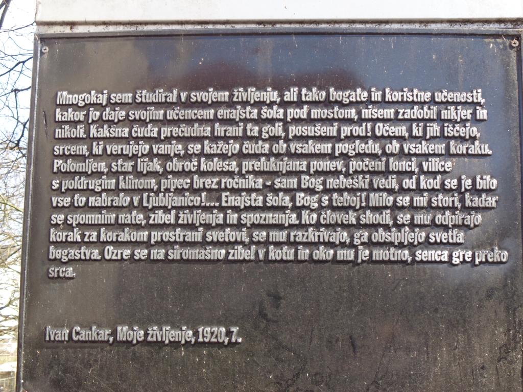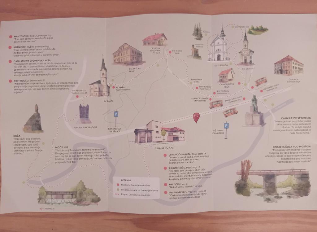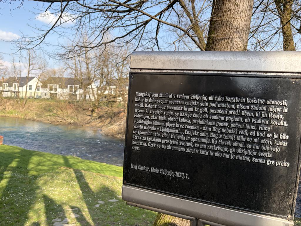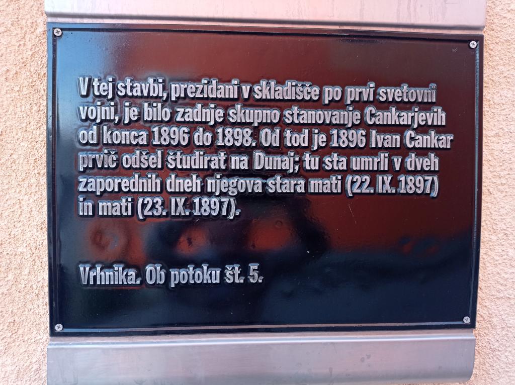 Spustili smo se na breg Ljubljanice, zelenico pod mostom, pisateljevi Enajsti šoli, kjer so mnogi vrhniški otroci pridobivali prva znanja in življenjske izkušnje. Obstali smo tudi pred vrhniško sodnijo, ki je ena najstarejših stavb v mestu. V njenem sklopu so bili zapori, v katerih je bil tudi Cankar. Po poti smo obnavljali življenjske dogodke pisatelja in njegove družine. Ko je bil star komaj tri leta, jim je pogorela hiša. Kasneje so stanovali v različnih hišah, celo hlevu. Danes je Cankarjeva rojstna hiša obnovljena in v njej so razstavljeni predmeti bivanjske kulture časa na prehodu stoletij, pisateljeva posmrtna maska, fotografije in prvotiski.
