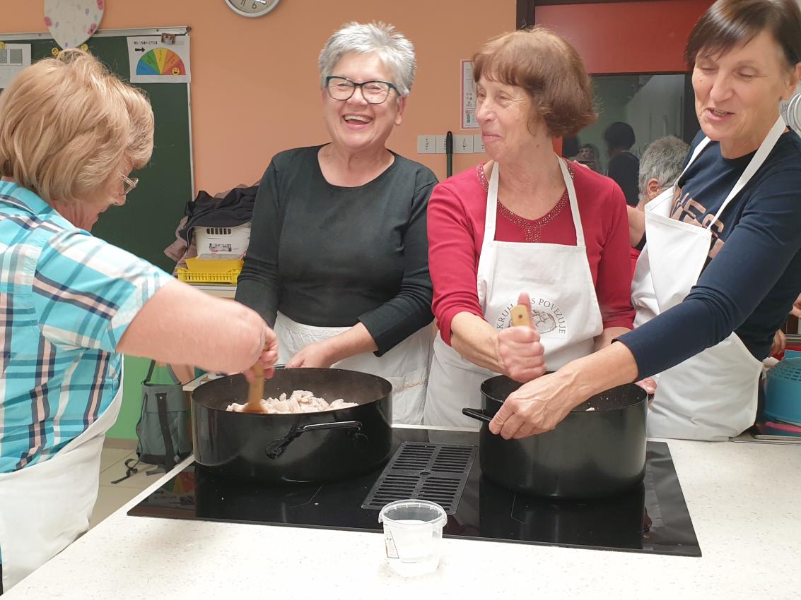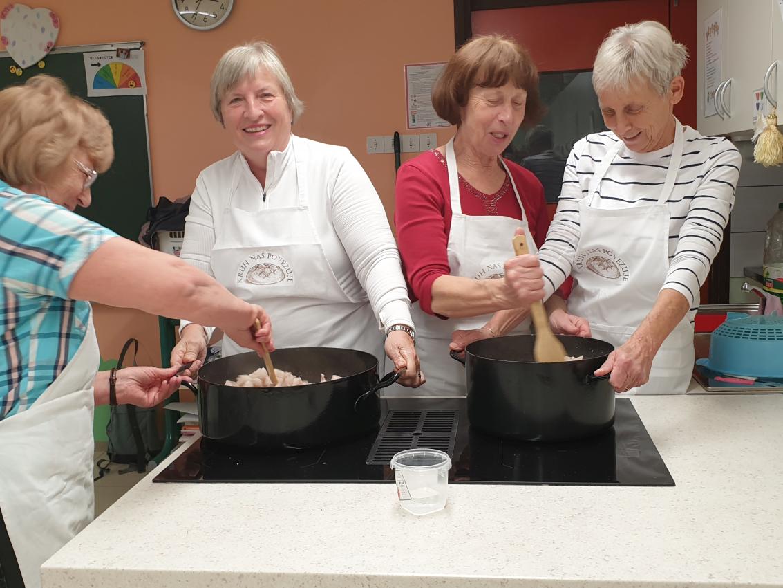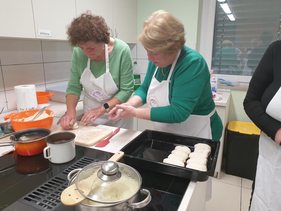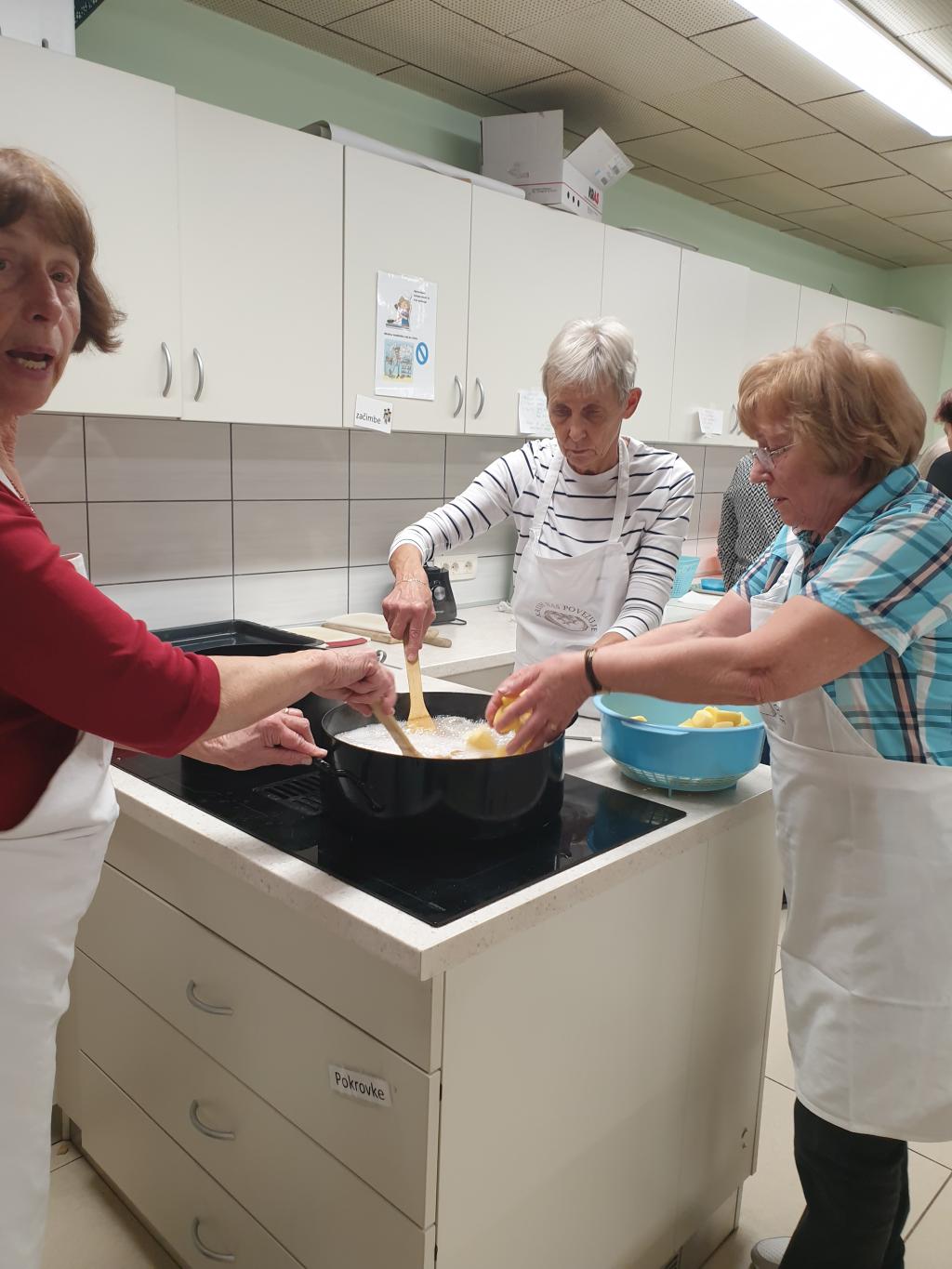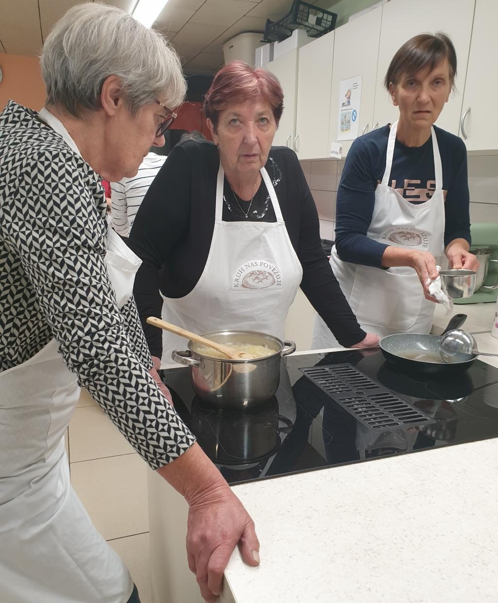 Tudi za skupino K(r)uharije je bil praznik, ko so se na mrzel zimski dan srečale na prvi  delavnici letošnjega študijskega leta in pripravljale krompir z ocvirki s prilogami kislega zelja in peko kruha.
