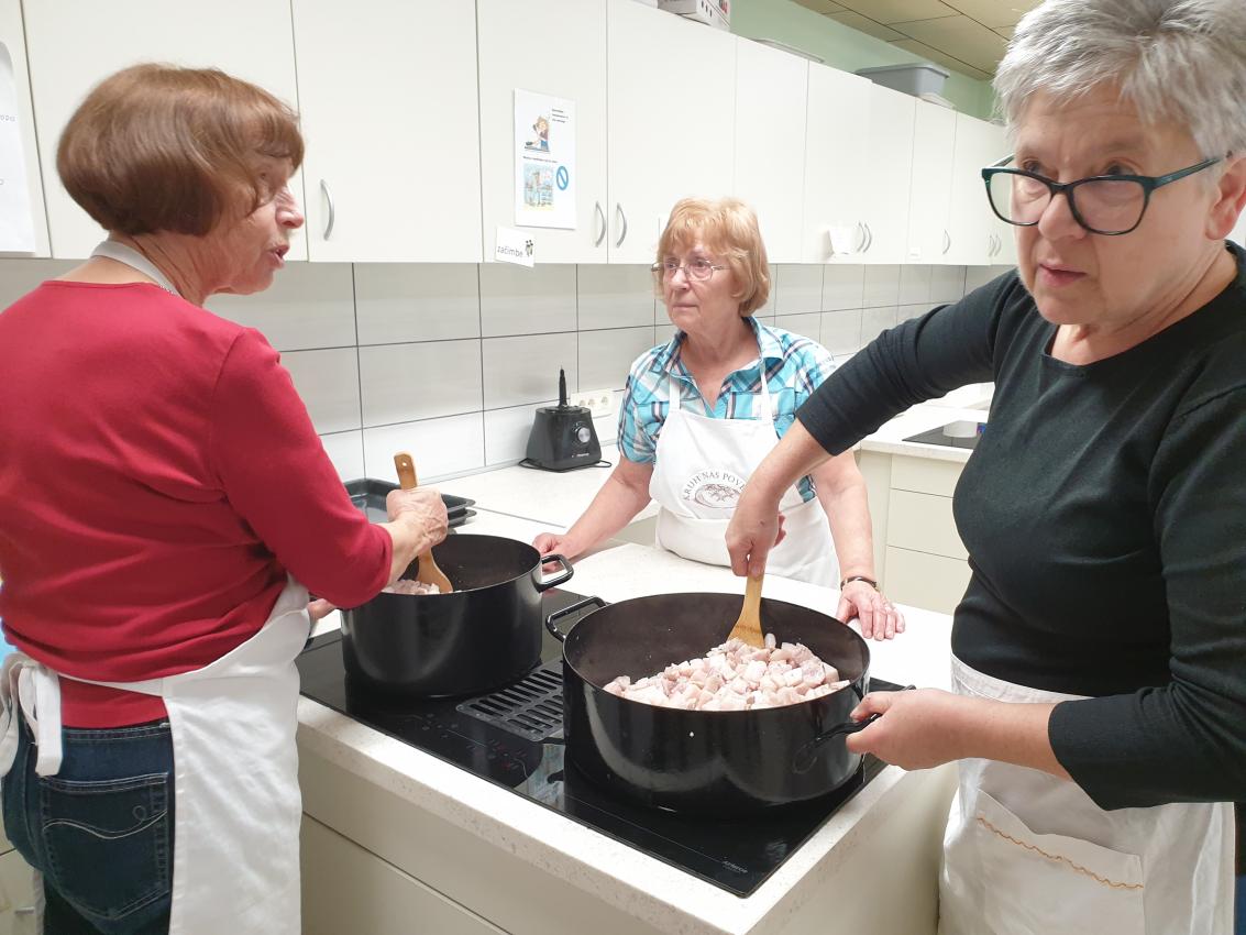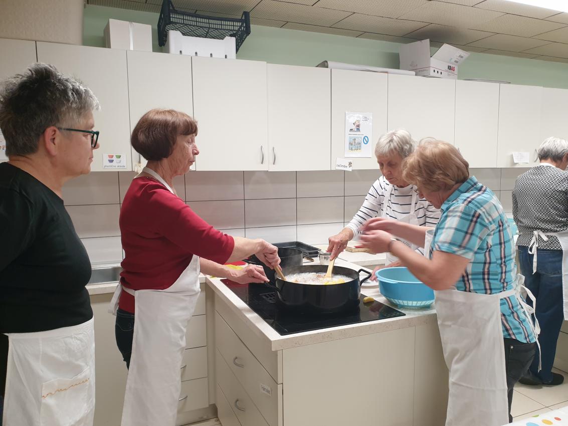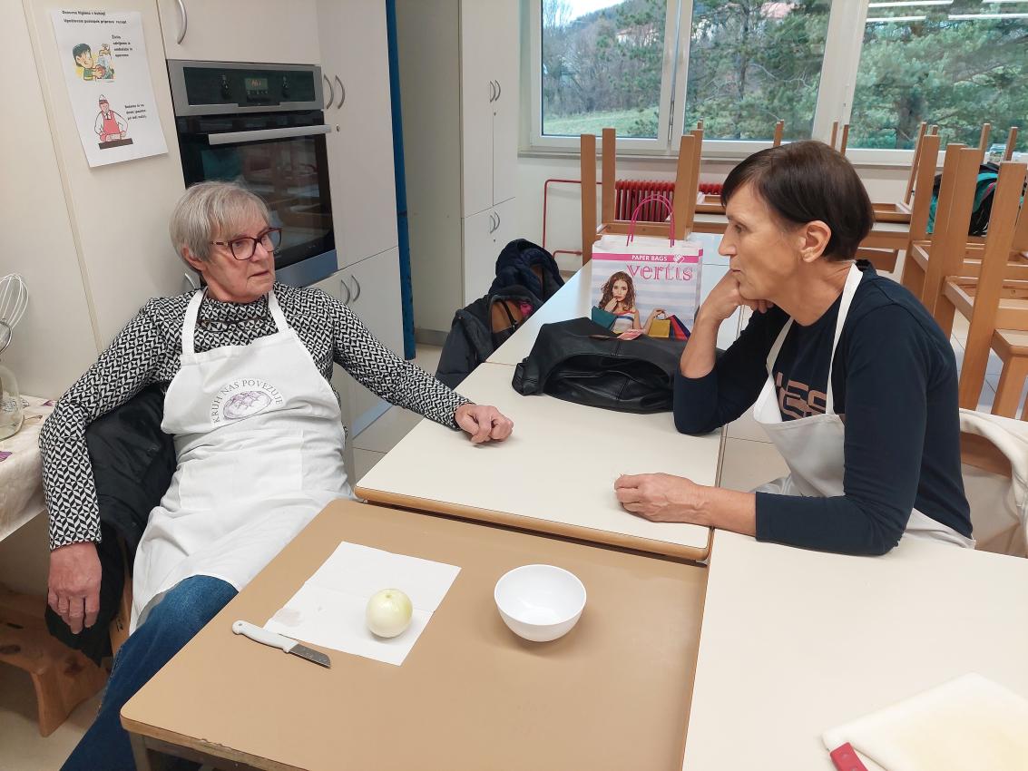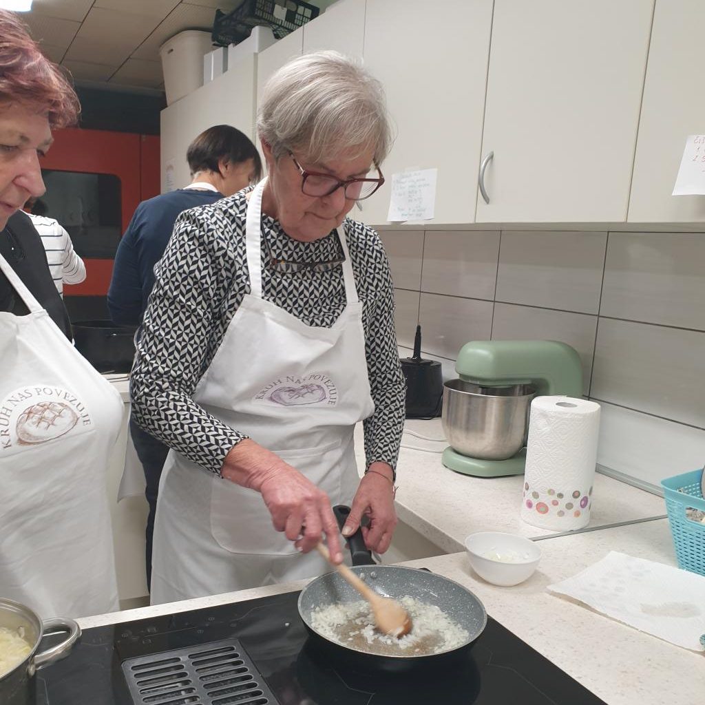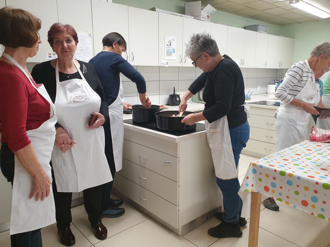 Tudi za skupino K(r)uharije je bil praznik, ko so se na mrzel zimski dan srečale na prvi  delavnici letošnjega študijskega leta in pripravljale krompir z ocvirki s prilogami kislega zelja in peko kruha.