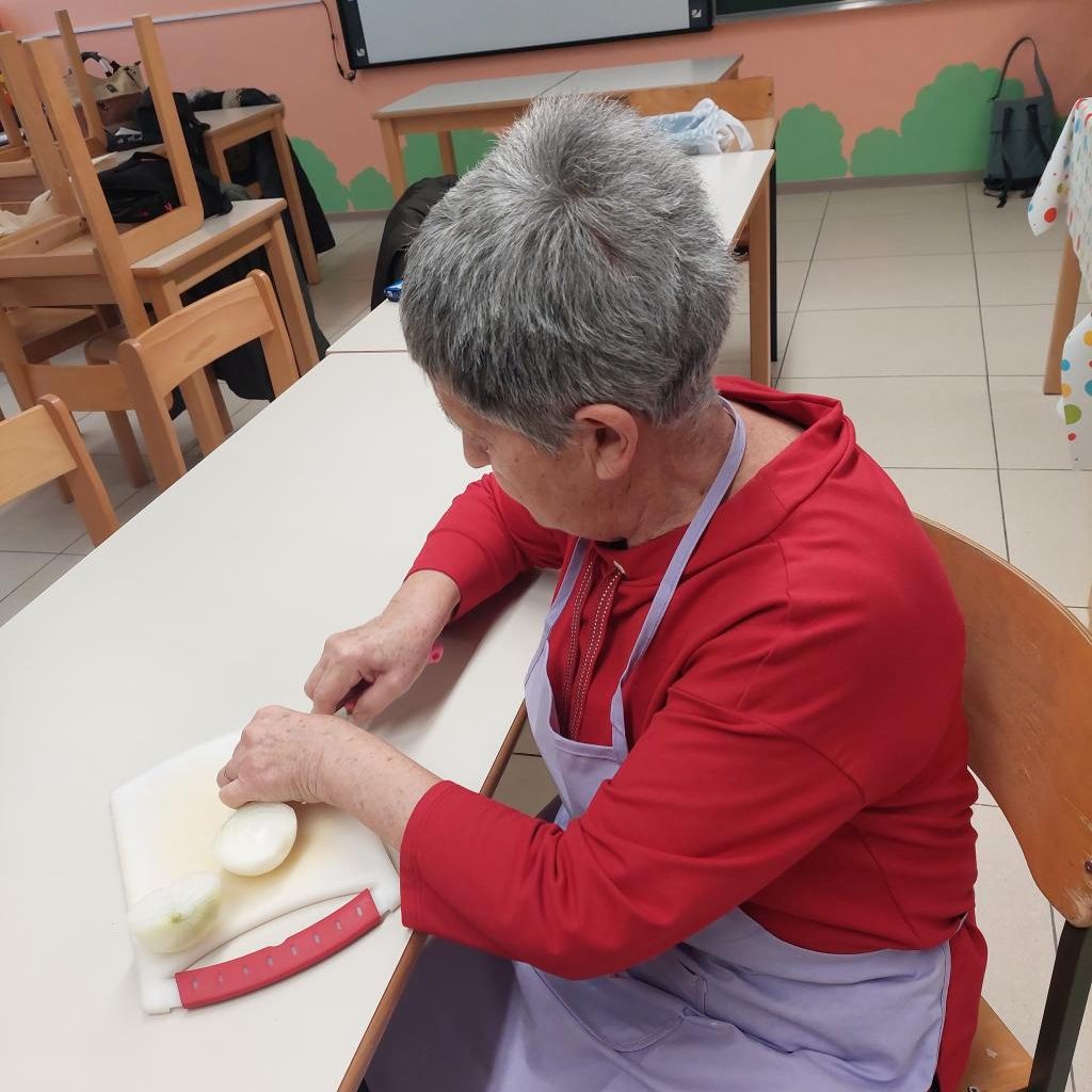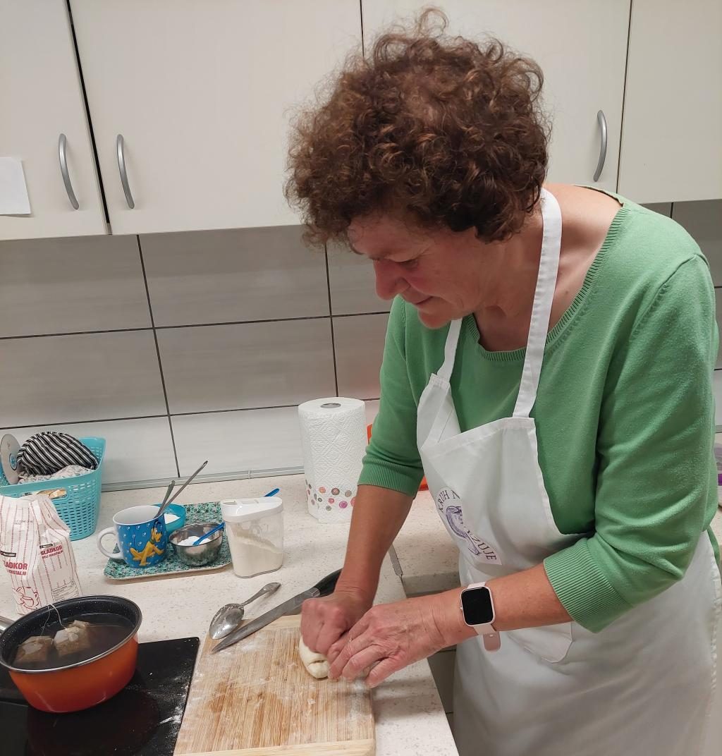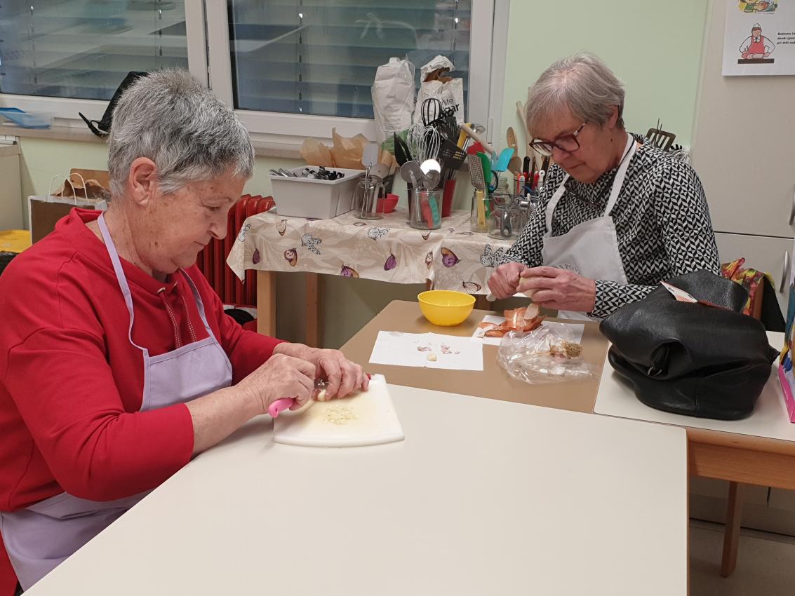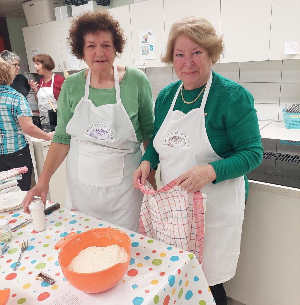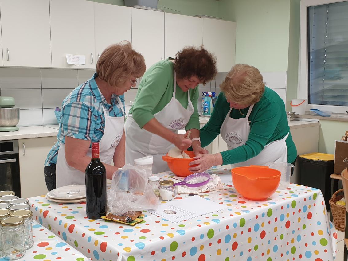 Tudi za skupino K(r)uharije je bil praznik, ko so se na mrzel zimski dan srečale na prvi  delavnici letošnjega študijskega leta in pripravljale krompir z ocvirki s prilogami kislega zelja in peko kruha.